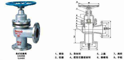 U44SM角式柱塞阀与直通式柱塞阀的工作原理完全相同,只不过是安装在管线中的位置不同,因而石油、化工、化肥、制药等长输管线中有不少的拐角转弯处,而角式柱塞阀正好装在这个部位,这样不但减少了接管弯头,安装方便,省工、省料等特点。